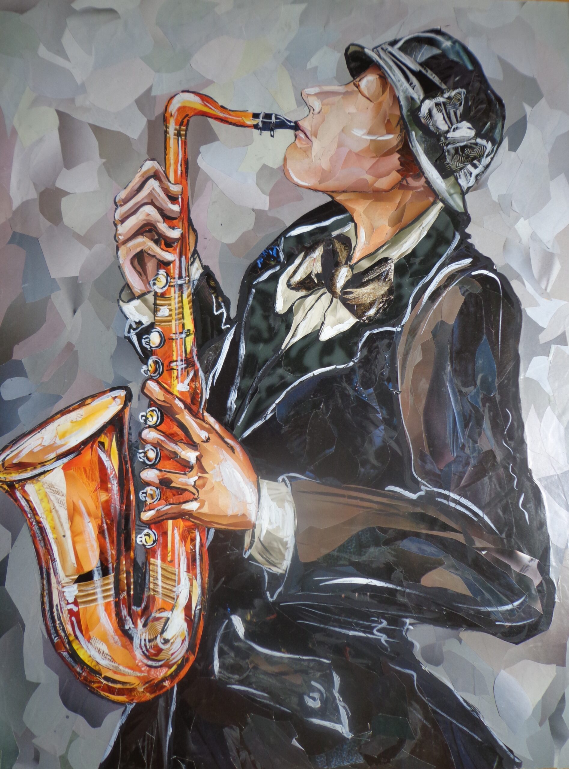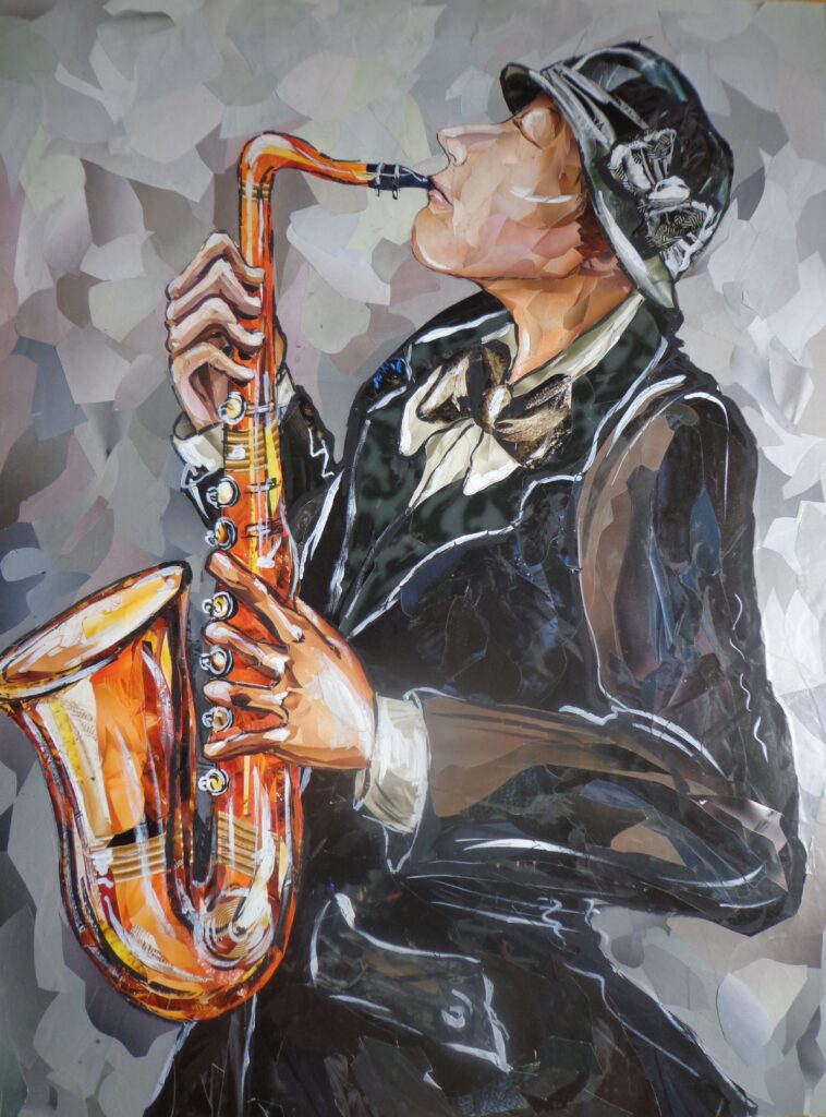 „საქსოფონისტი“, 79x61სმ, ქაღ. მოზაიკური კოლაჟი, გუაში, 2006